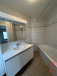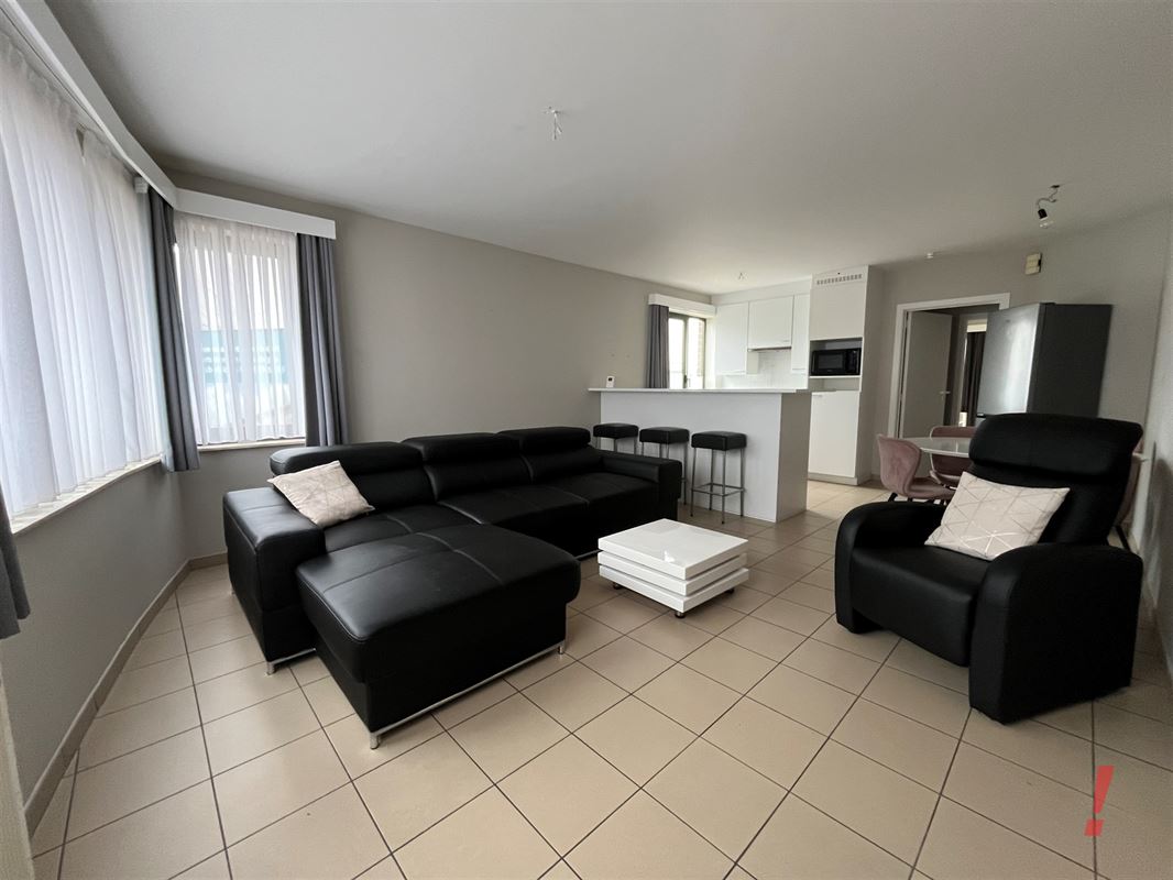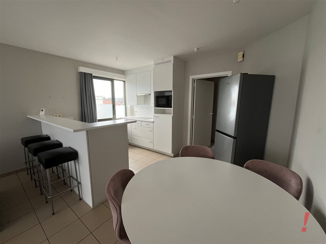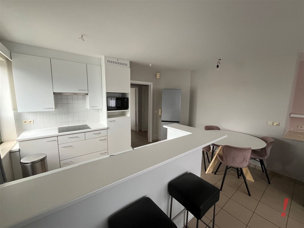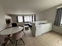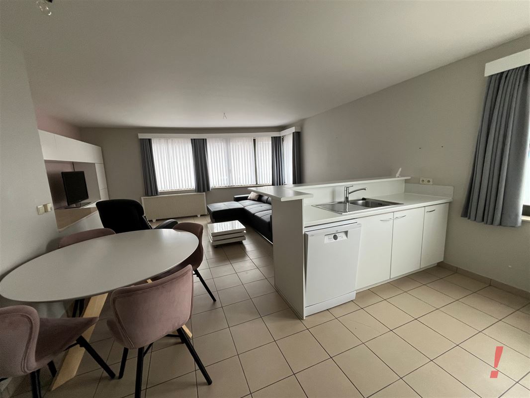 Er is een inkomhal met toilet, woonkamer met open ingerichte keuken voorzien van oven, kookfornuis, dampkap en frigo. Veel lichtval gezien het een hoekappartement is.
