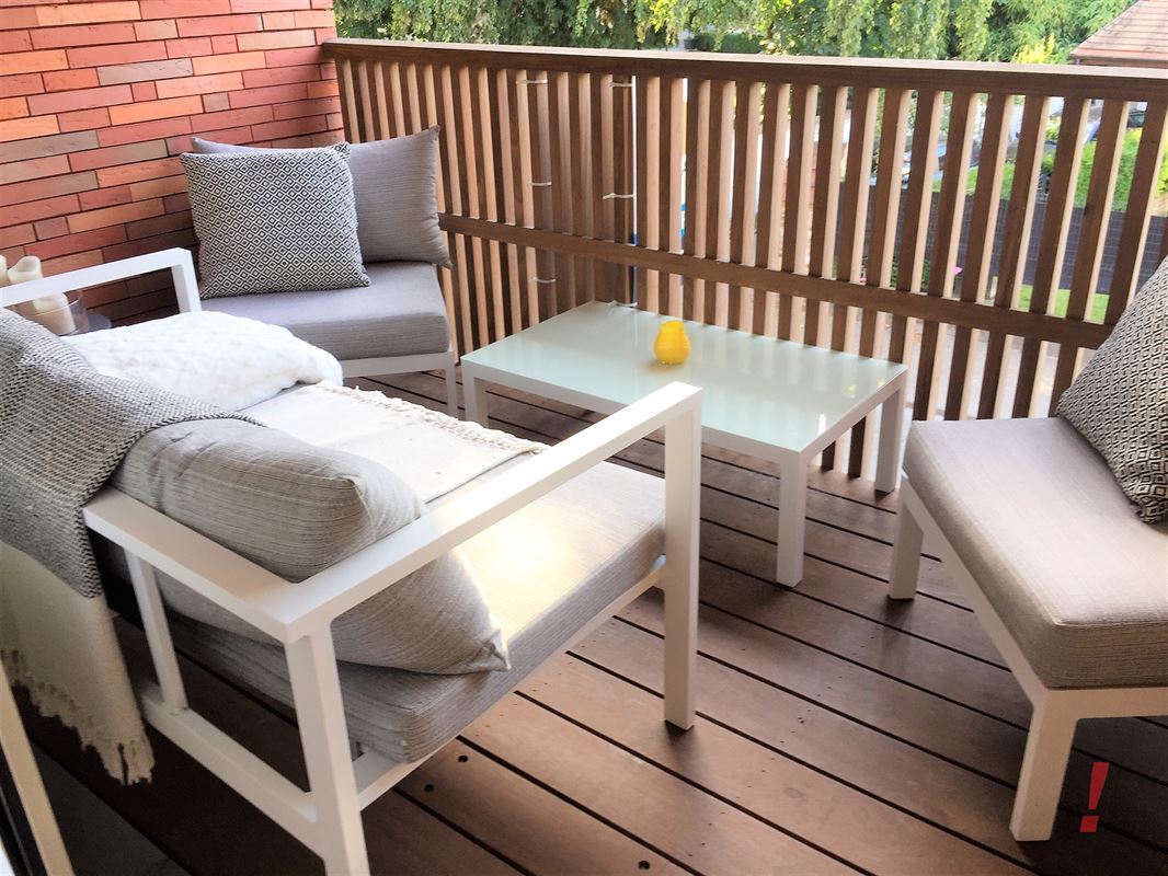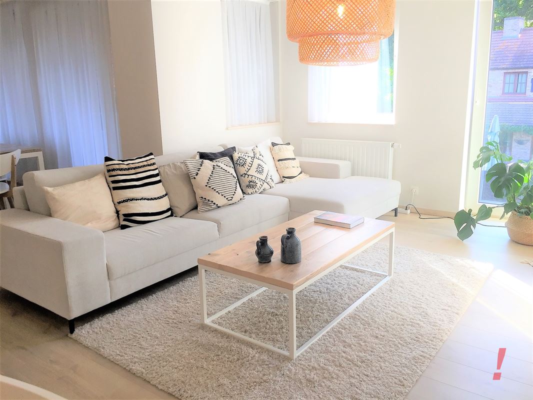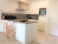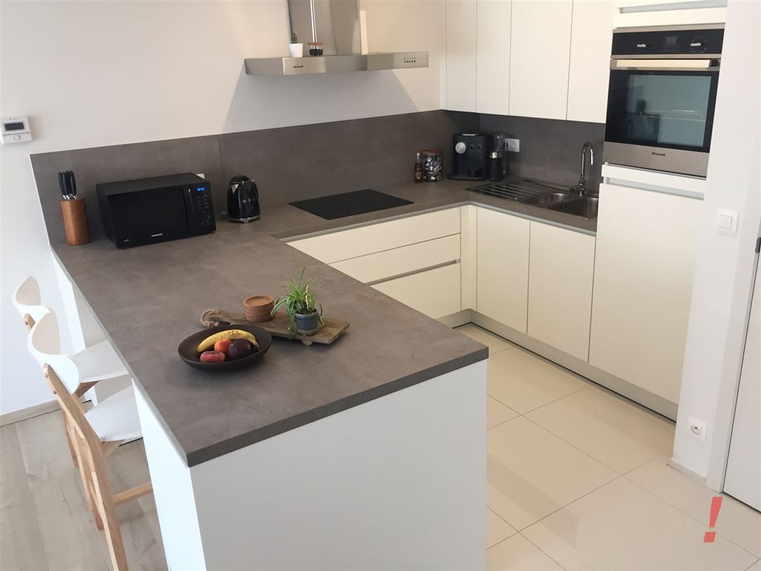 Verder is er een ruime en lichte woonkamer, waarvan de eetkamer direct alsook toegang geeft tot het 1e terras. De moderne open keuken is voorzien van hoogwaardige inbouwapparatuur en een stijlvol kookeiland, waarbij de witte afwerking en de lichte tegelvloer een frisse en cleane uitstraling geven.