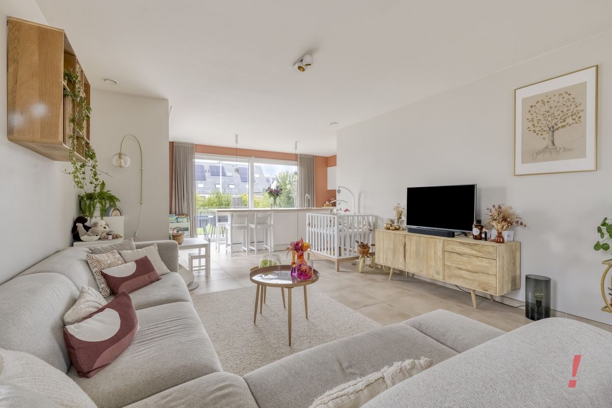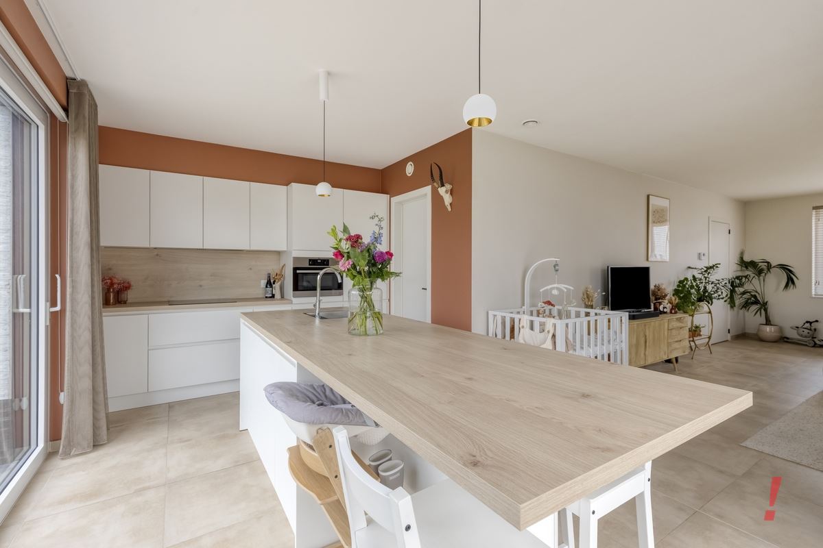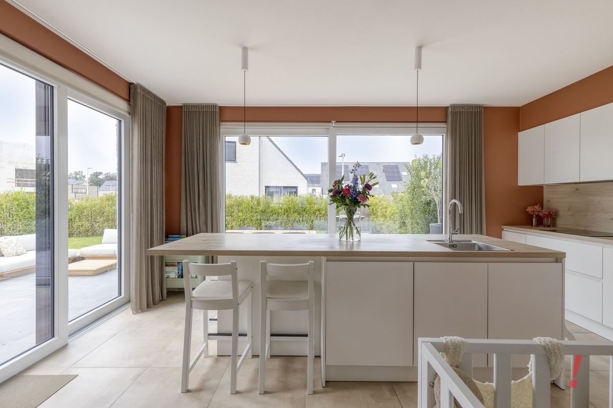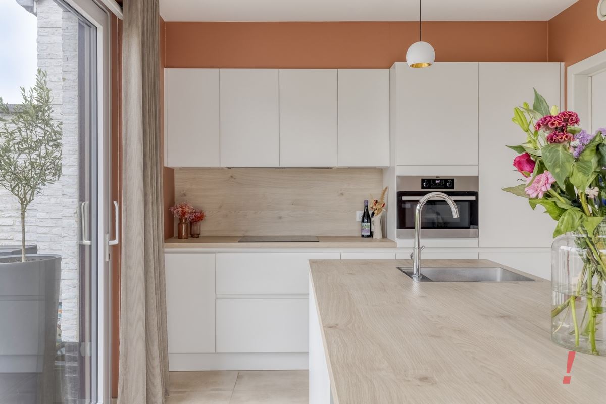 Er is een lichtrijke woonkamer met grote open keuken. De keuken is volledig ingericht, voorzien van alle toestellen en is als het ware het levende hart van de woning dankzij de grote raampartijen met zicht op de tuin.