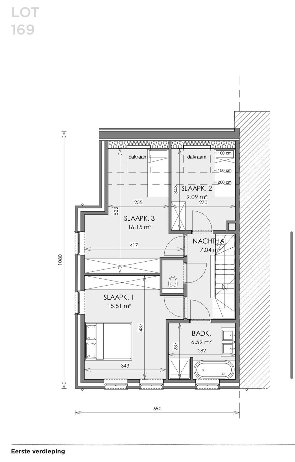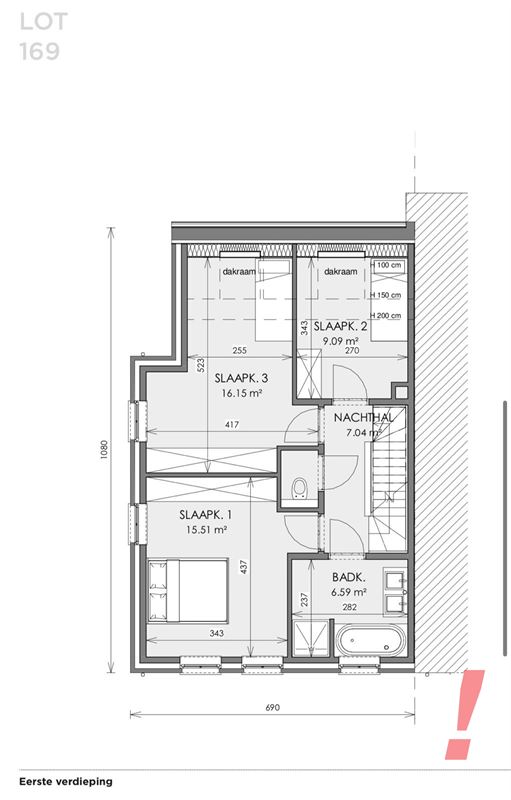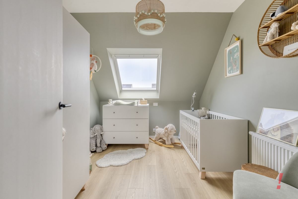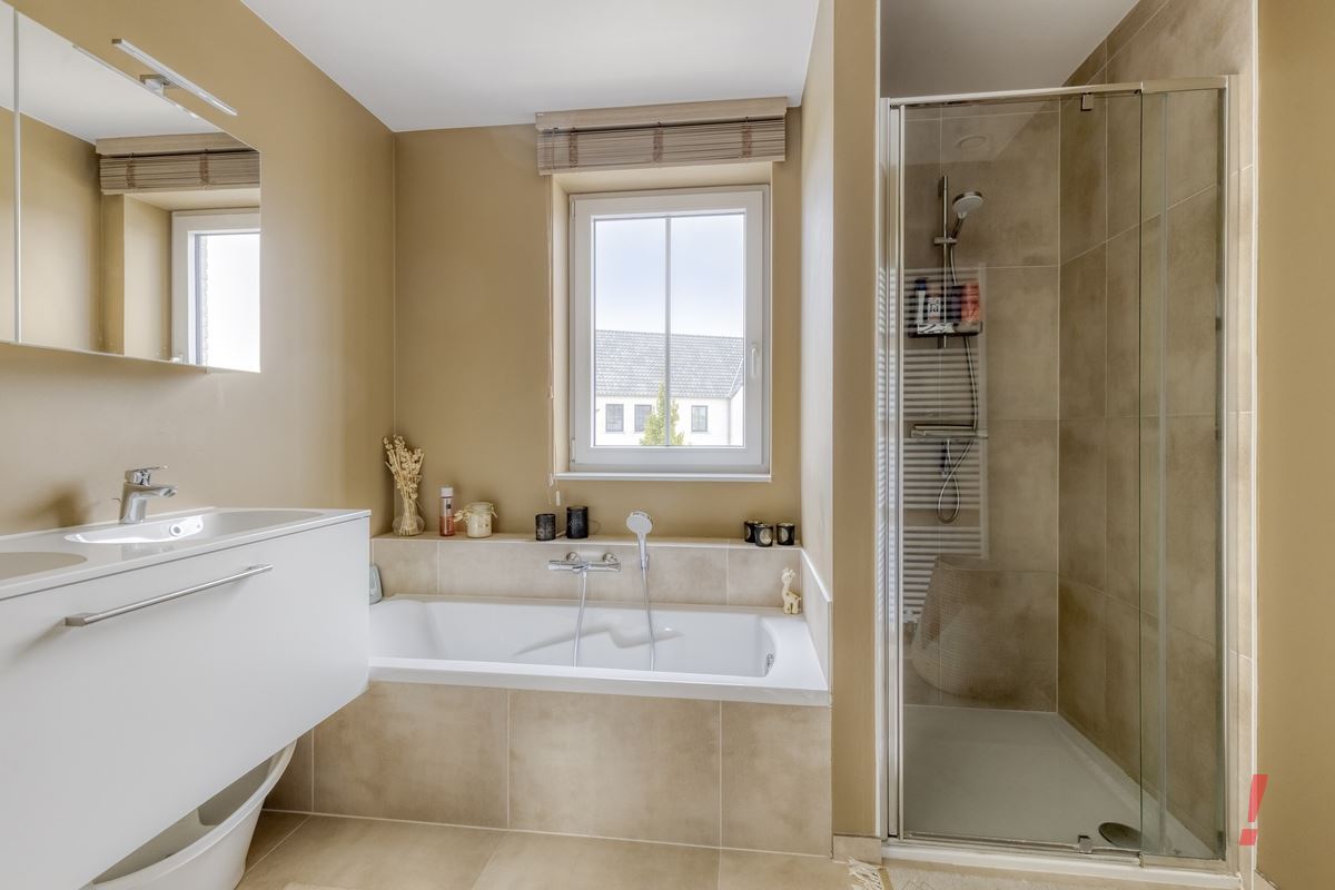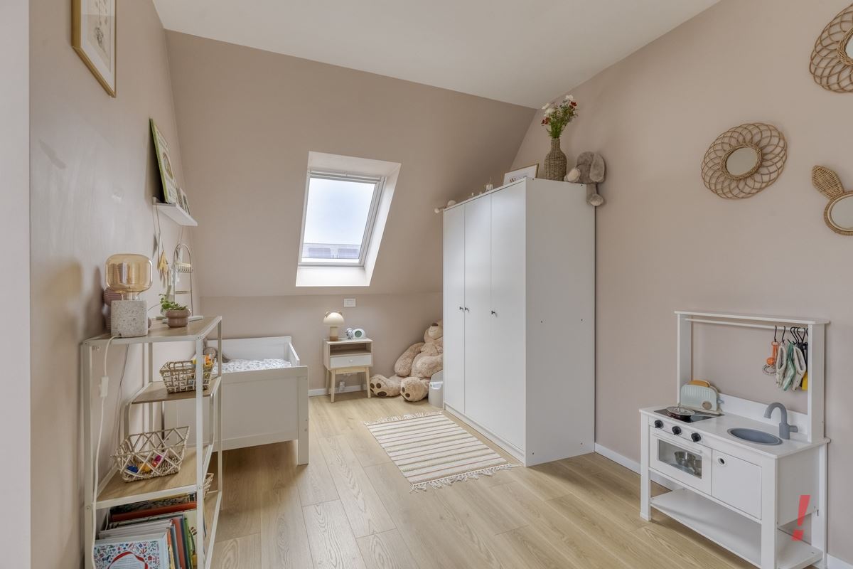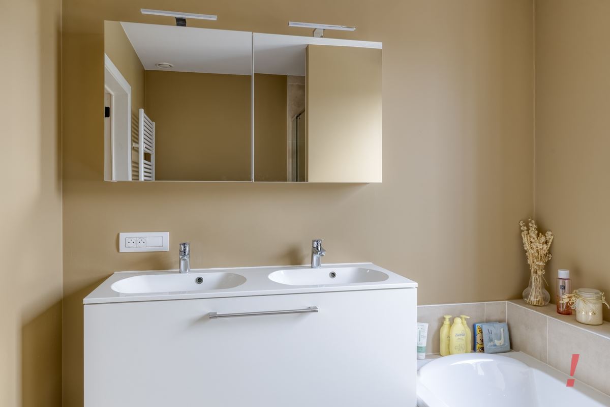 Via de traphal is de 1e verdieping bereikbaar met 2 volwaardige slaapkamers en een 3e kinderkamer. Op dit verdiep bevindt zich de badkamer met dubbel lavabomeubel en zowel een ligbad alsook douche, er is een apart toilet.