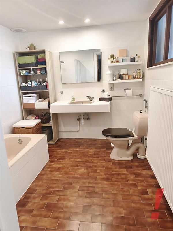 Naastliggend is een wasruimte met achterdeur naar de tuin. Badkamer met lavabo, toilet en bad. Ook is er een kelder.